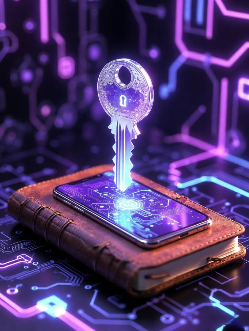 Glowing holographic key emerging from an old leather-bound notebook on a cluttered desk, with a smartphone showing crypto icons nearby, captured from a slightly low-angle personal perspective like I’m snapping it from my couch. Descriptive alt text: My dream setup for the best crypto wallet – old-school security meets digital glow, kinda chaotic like my life.